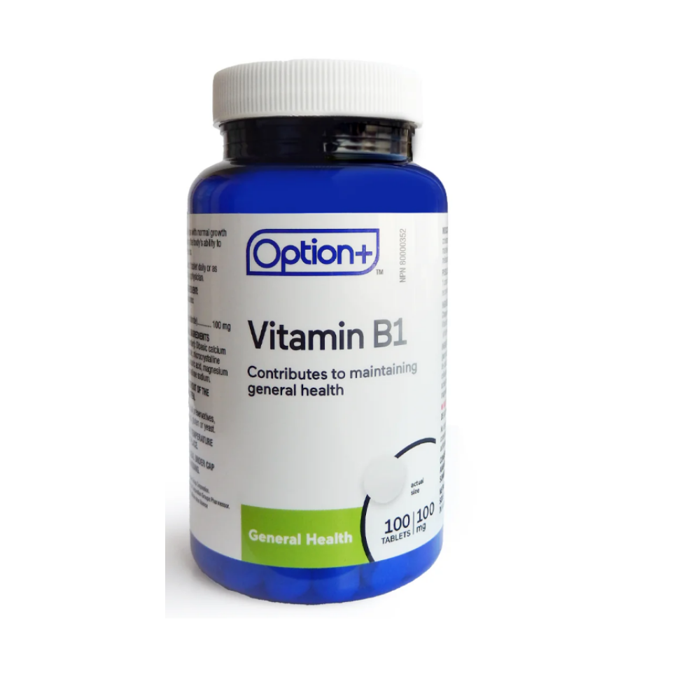option+ Vitamin B1 Tablets provide 100 mg of thiamine (vitamin B1) per tablet in a convenient 100-tablet pack. Thiamine is a water-soluble B-group vitamin that supports normal energy metabolism by helping the body convert carbohydrates into energy. It also contributes to the normal function of the nervous system and supports normal psychological function and heart function as part of a balanced diet.
